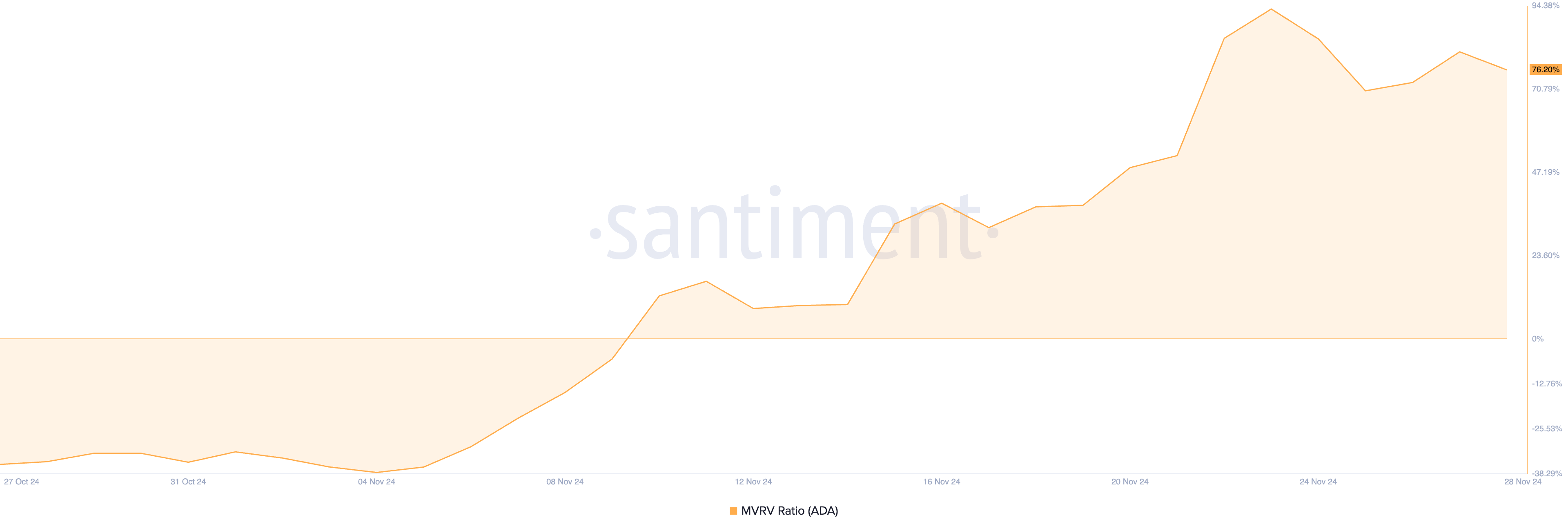 Una evaluación de la relación entre el valor de mercado y el valor realizado (MVRV) de $ADA confirma este riesgo. Según los datos de Santiment, el MVRV ratio actual de $ADA es del 76.20%.