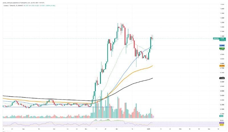 Desde el punto de vista de los precios, $ADA ha tenido un buen desempeño; rompió una resistencia importante en la EMA 50 y ahora cotiza alrededor de 1.08 dólares por acción. La criptomoneda había enfrentado previamente un obstáculo importante en este nivel, pero su ruptura sugiere que puede haber más posibilidades de subir. El volumen de operaciones, por otro lado, ha disminuido constantemente, lo que sugiere que puede que no haya un fuerte apoyo de los participantes del mercado a los recientes movimientos de precios.