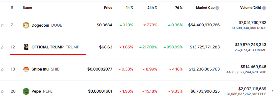 Pocas horas tras su lanzamiento, la moneda meme Official Trump (TRUMP) se convierte en la segunda más grande en capitalización de mercado. Su empuje le permite alcanzar los $13.725 millones de dólares en valoración, con lo que supera cómodamente a la legendaria Shiba Inu (SHIB). Tras varios años de ser la lugarteniente de DOGE, ahora SHIB pasa al tercer puesto con $12.100 millones en market cap.