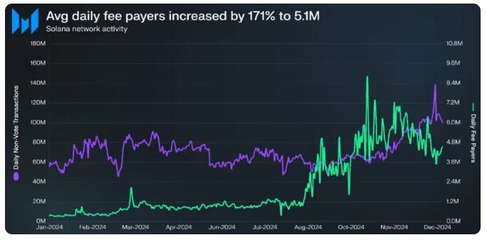 Curiosamente, la tarifa de transacción promedio experimentó un repunte notable, aumentando un 122% intertrimestral a 0.05 dólares, impulsada por una mayor actividad de la red alimentada por la especulación sobre un entorno regulatorio más favorable para las criptomonedas en los EE. UU.
