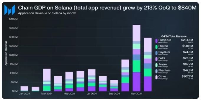 El informe revela un asombroso crecimiento intertrimestral (QoQ) del 213% en el PIB de la cadena, esencialmente los ingresos totales de la aplicación generados en la red Solana, que aumentaron de 268 millones de dólares en el tercer trimestre a unos impresionantes 840 millones de dólaresen el cuarto trimestre. Noviembre se destacó como el mes más lucrativo, aportando 367 millones de dólares al ecosistema.