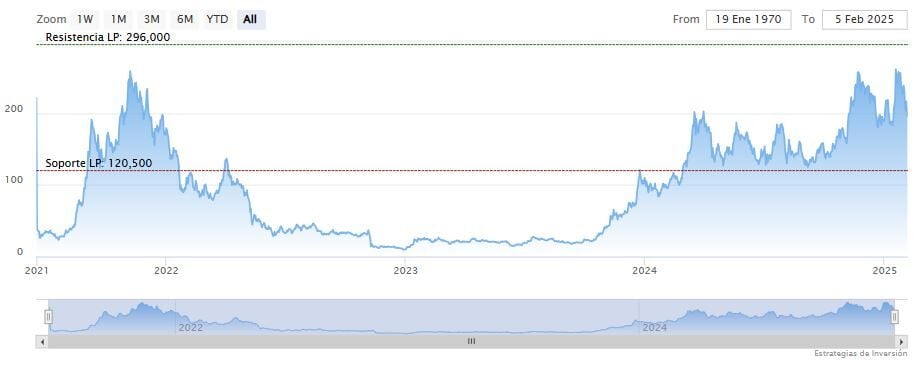 Solana cotiza en verde al mediodía del jueves en los 201.31 dólares. Las medias móviles de 70 y 200 periodos rodean a las velas semanales, RSI al alza en los 41 puntos y la línea rápida (azul) del MACD por debajo del nivel de cero.