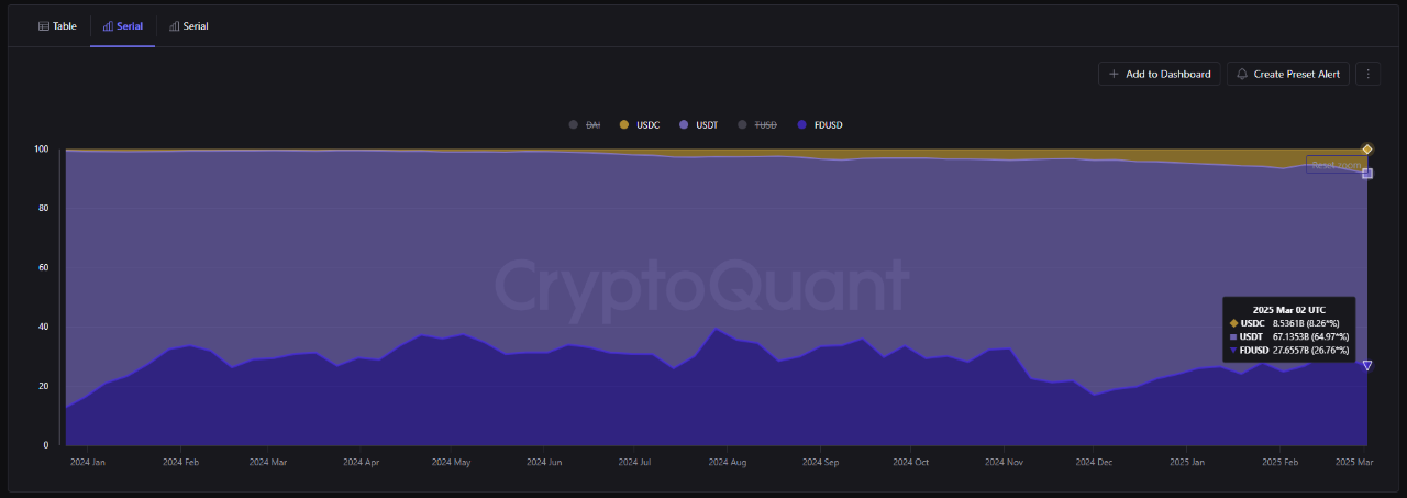 Según datos de CryptoQuant, la presencia de $USDC en Binance ha aumentado un 1,621% en el último año. Con la implementación de las regulaciones MiCA, las plataformas de criptomonedas en la UE se ven obligadas a eliminar las stablecoins no conformes, dando a $USDC una ventaja competitiva. El anuncio de Binance de que no ofrecerá $USDT a los usuarios de la UE a partir del 31 de marzo de 2025, fortalece la posición de $USDC en la región.