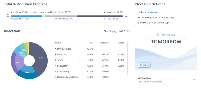 El 9 de marzo, la red Xai desbloqueará 35,89 millones de tokens XAI, valorados en aproximadamente 2,62 millones de dólares. La red asignará la mayor parte de este desbloqueo, alrededor de 17,33 millones de tokens XAI, a los inversores. Además, 11,9 millones de tokens serán para el equipo.