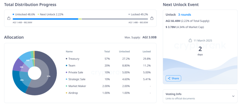 - Número de Tokens a Desbloquear: 66,48 millones de AGI (2,22% del Suministro Máximo)