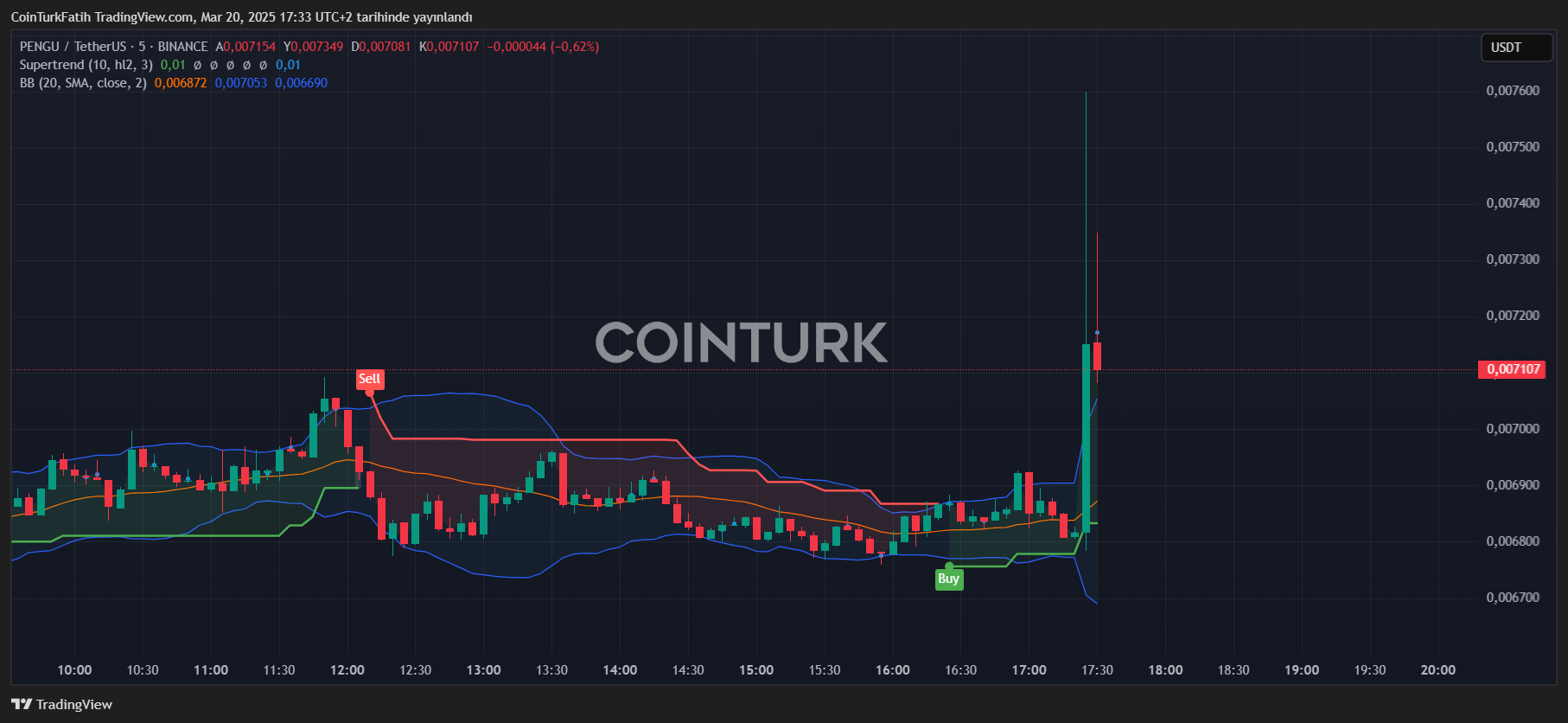 Hace solo minutos, Canary presentó su formulario de solicitud S-1. La Moneda PENGU, que recientemente realizó un airdrop en la red Solana, ha visto un descenso significativo desde ese momento. Tras el anuncio, el precio subió de $0.00682 a $0.00760, reflejando un aumento de más del 10%, antes de estabilizarse alrededor de la marca de $0.007.