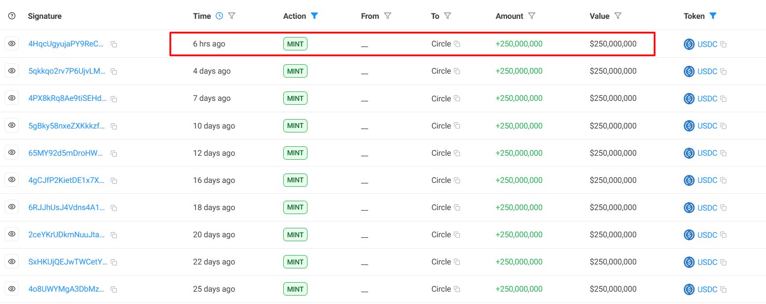 Circle, una empresa estadounidense de tecnología financiera y phaces, recientemente acuñó 250 millones adicionales de $USDC en la red Solana. Esta acuñación, reportada por la plataforma de datos blockchain Onchain Lens, ocurrió en las primeras horas del día y corresponde a un valor total de 250 millones de dólares. Esta última acuñación continúa la tendencia de Circle de producir $USDC en Solana a lo largo del año, llevando la cantidad total acuñada en la red Solana en los últimos 30 días a 2.5 mil millones de $USDC y un total de 10.75 mil millones de $USDC desde el comienzo del año.