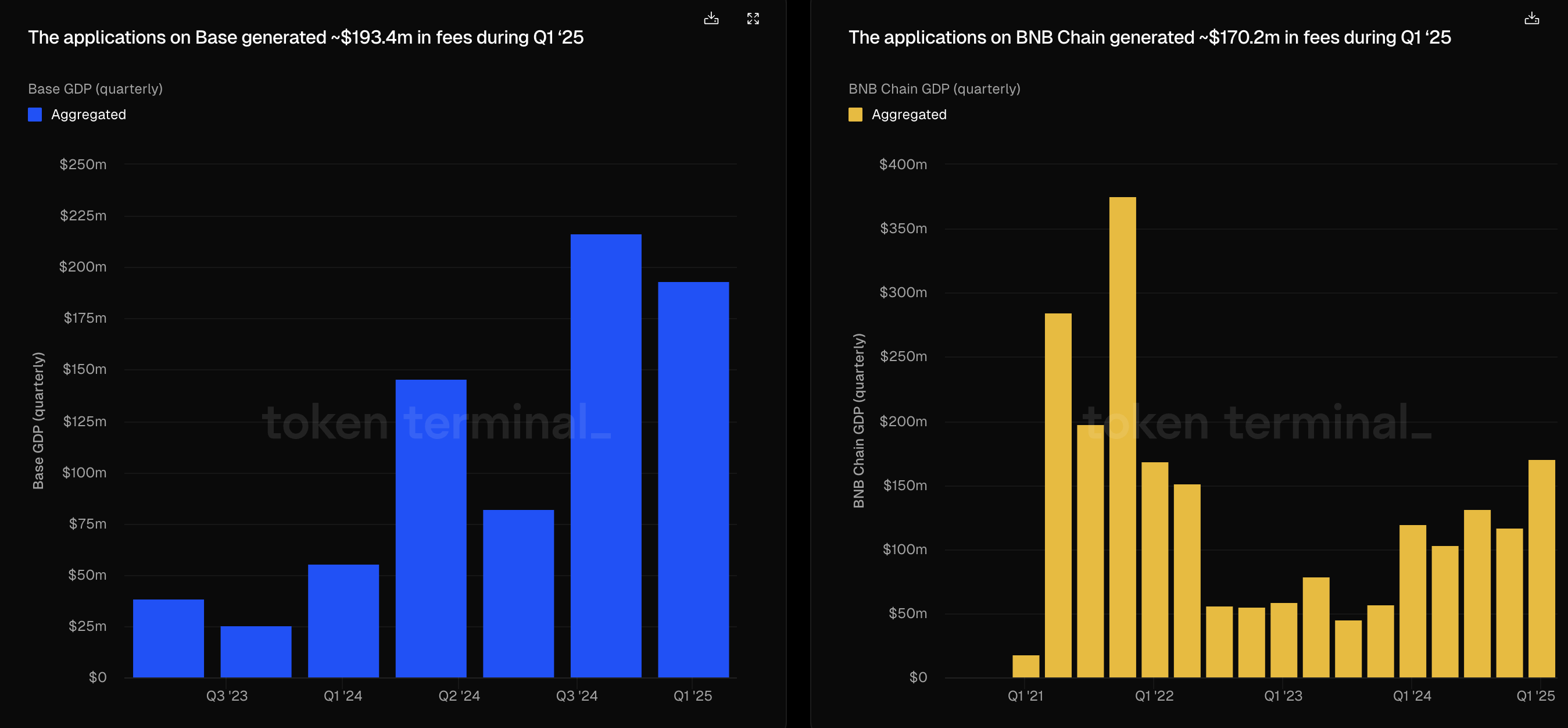 Tarifas de dApps de BSC Chain vs. Base Q1 2025 | Fuente: Token Terminal