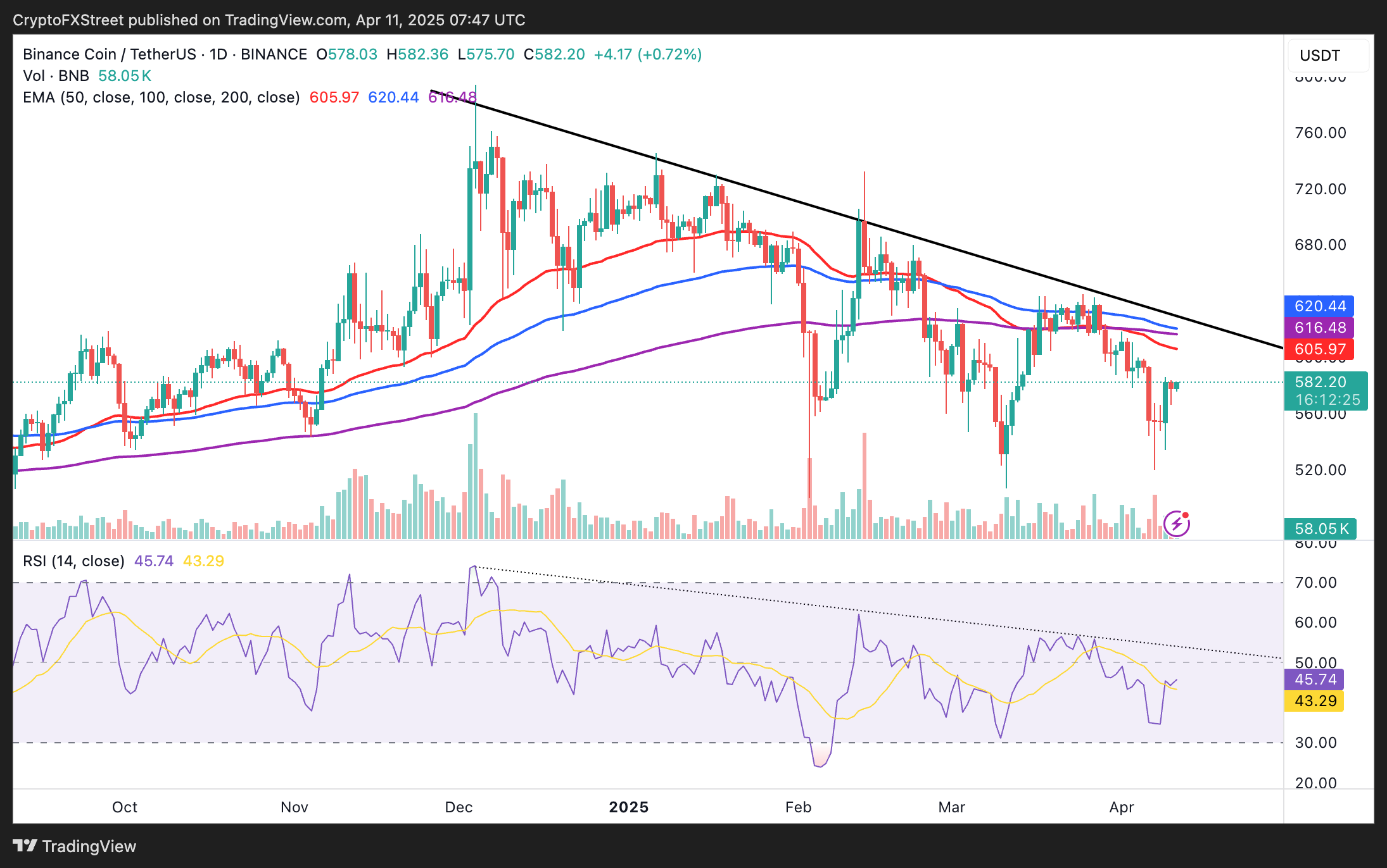 Binance Coin enfrenta resistencia en 580$ en el momento de escribir el viernes a pesar del rebote de mitad de semana provocado por la pausa de 90 días en los aranceles del presidente de EE.UU., Donald Trump, tras la caída del lunes a 520$.