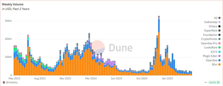 No obstante, en medio de este debate, el volumen semanal de trading de OpenSea ha caído un 90% desde su pico a pesar de las recompensas de XP.