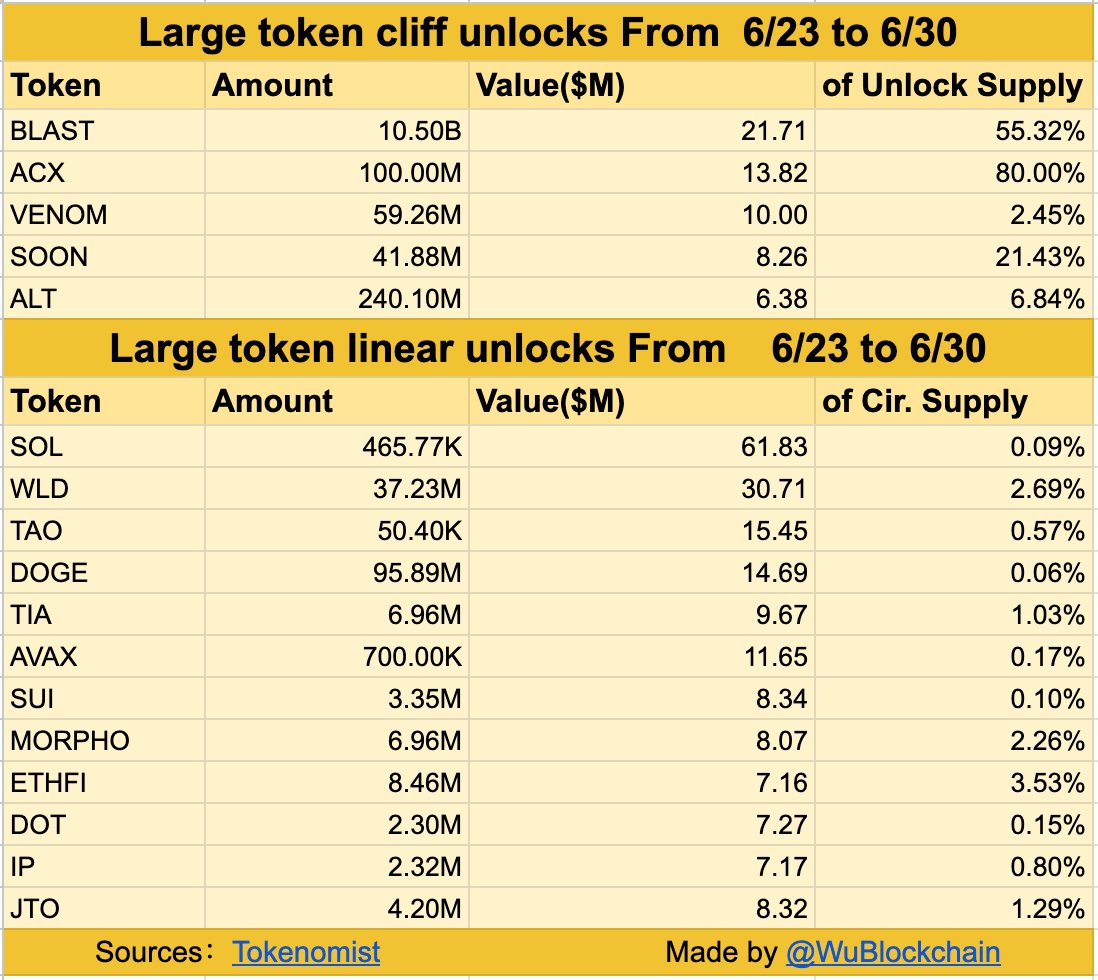 Además, se anticipan desbloqueos significativos de monedas durante toda la semana para otras criptomonedas como BLASK, ACX, VENOM, SOON, ALT, WLD, TAO, TIA, AVAX, SUI, MORPHO, ETFI, DOT, IP, y JTO.