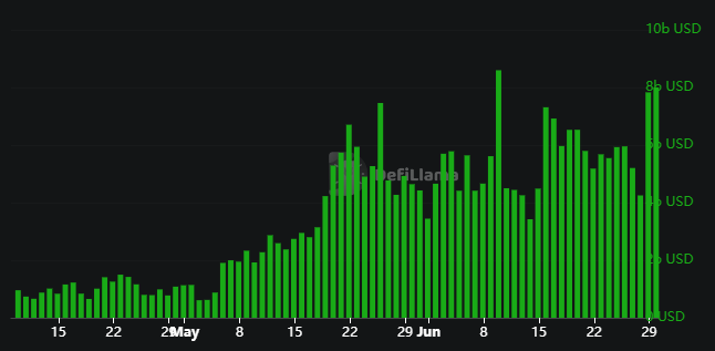 Según DeFiLlama, el 29 y 30 de junio se registraron picos diarios cercanos a los 8.000 millones de dólares, duplicando los valores de algunos días previos, como se ve en la siguiente imagen: