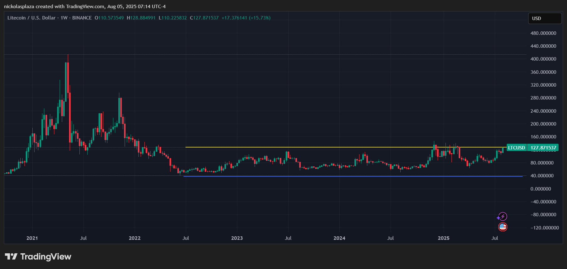 Paralelamente, se observa un fuerte nivel de soporte alrededor de los 40 dólares (línea azul), que ha impedido caídas mayores. La ubicación actual de LTC, como se observa en la última vela, lo sitúa precisamente en el umbral de esta resistencia histórica, lo que sugiere que el mercado se encuentra en un punto crítico donde los operadores buscarán señales de una posible ruptura al alza o un retroceso.