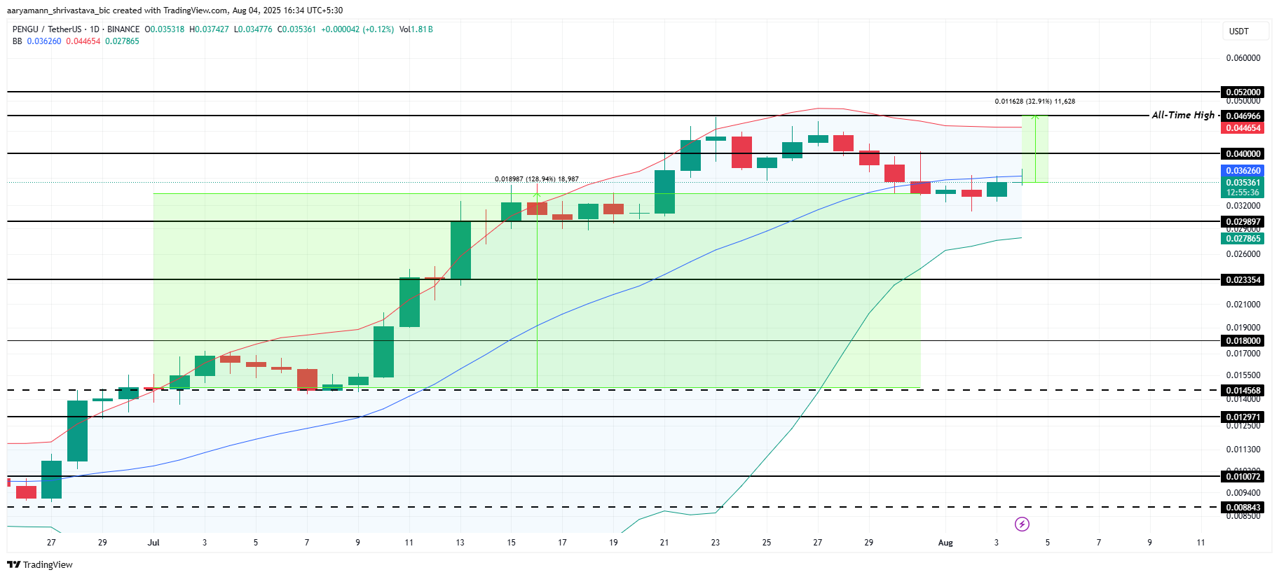 La volatilidad desencadenada por el estrechamiento de las Bandas de Bollinger se espera que impulse el precio de PENGU más alto. Si la altcoin supera la resistencia de 0.040 dólares, podría avanzar hacia el ATH de 0.046 dólares.