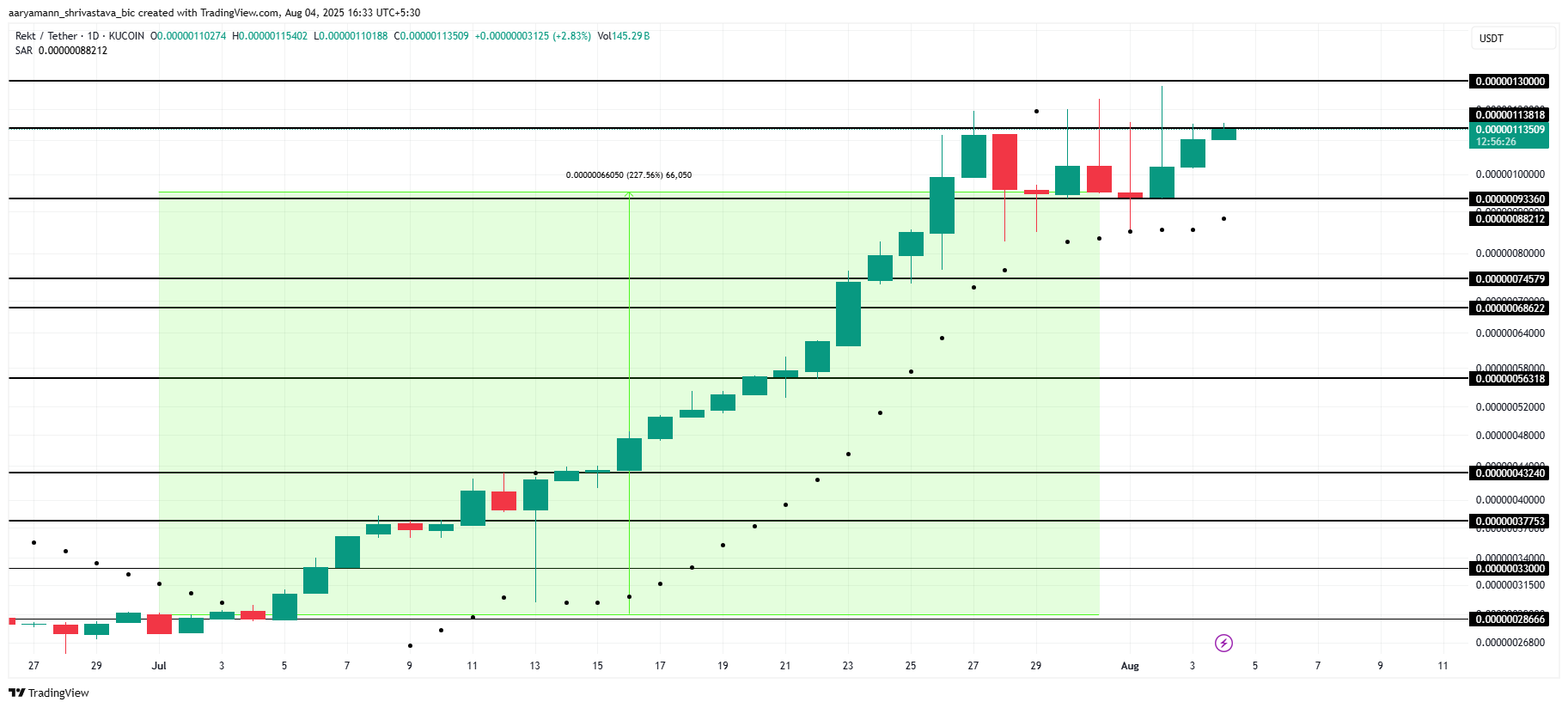 REKT ha mostrado un crecimiento impresionante en julio, aumentando un 221%. La altcoin ahora se negocia a 0.000001155 dólares y continúa manteniendo un fuerte momentum este mes.