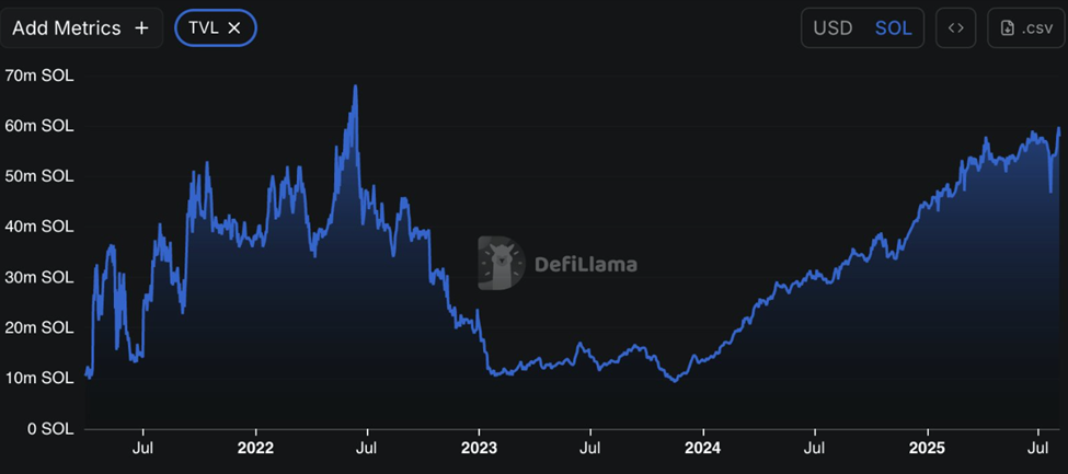 Al mismo tiempo, los datos de DeFiLlama muestran que el TVL (Valor Total Bloqueado) de Solana en términos de SOL nativo es ahora el más alto en más de tres años. Esto indica una creciente adhesión entre los usuarios y los protocolos DeFi.