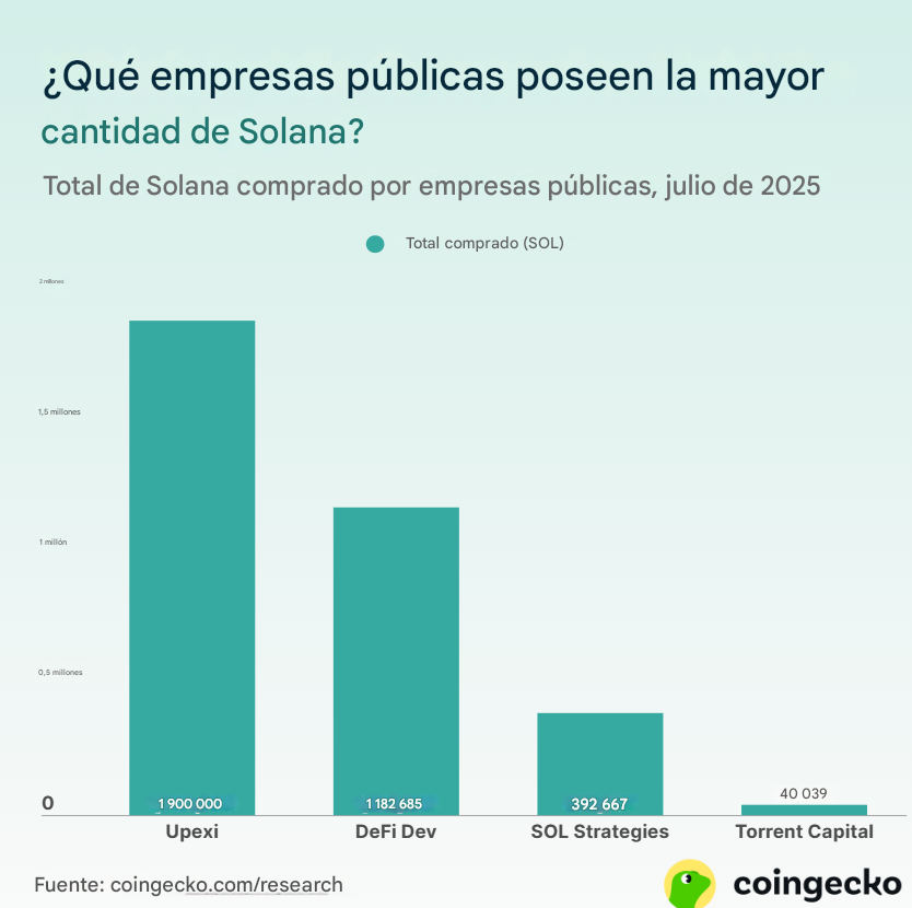 Upexi, DeFi Developments Corp, SOL Strategies y Torrent Capital concentran la mayor parte de este volumen. En conjunto, controlan posiciones valoradas en más de 591,1 millones de dólares, lo que representa el 0,65% del suministro circulante de SOL, que es de 539,13 millones de solana.