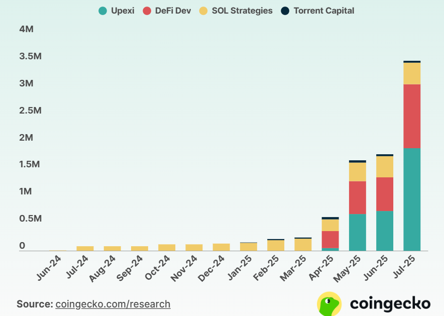 Hasta ahora, más de 3,5 millones de SOL están actualmente en manos de empresas que cotizan en bolsa. Estas firmas lo mantienen como parte de sus reservas de tesorería.