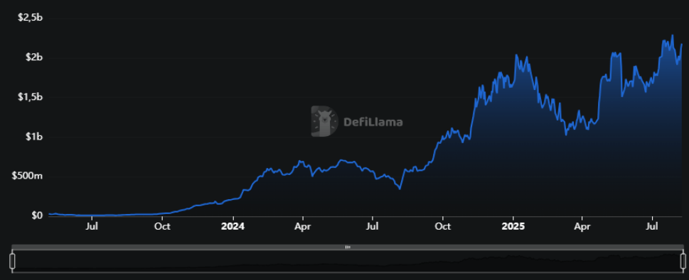 La red de Sui figura entre las de mayor crecimiento en el ámbito de las finanzas descentralizadas (DeFi). Actualmente, las aplicaciones desarrolladas sobre esta blockchain acumulan un valor total bloqueado (TVL) de 2.180 millones de dólares. Este indicador equivale, en el mundo DeFi, a los activos bajo administración (AUM) en las finanzas tradicionales.