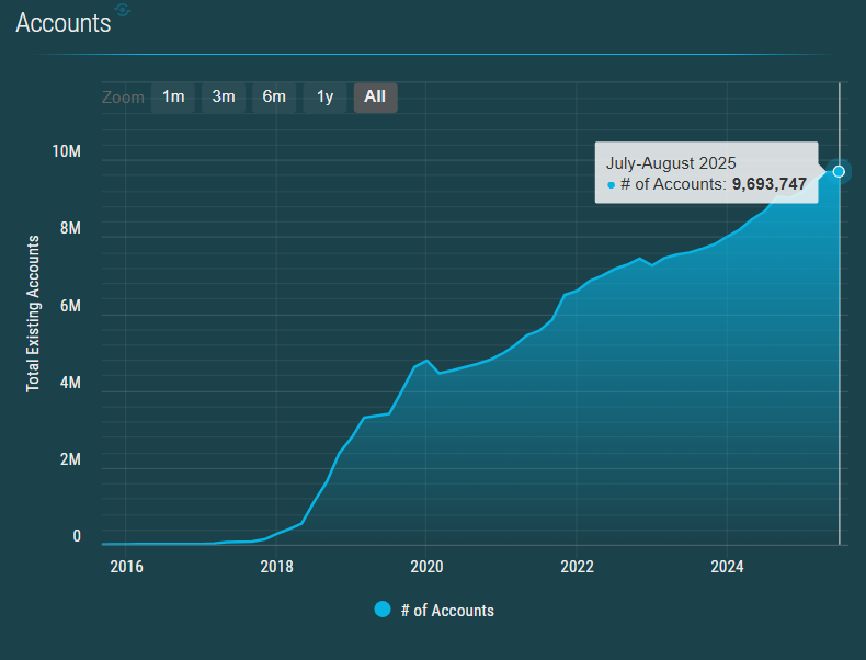 El segundo récord es el número de cuentas XLM alcanzando un nuevo pico de más de 9.69 millones. Datos de Stellar Expert indican que la red se ha expandido significativamente.
