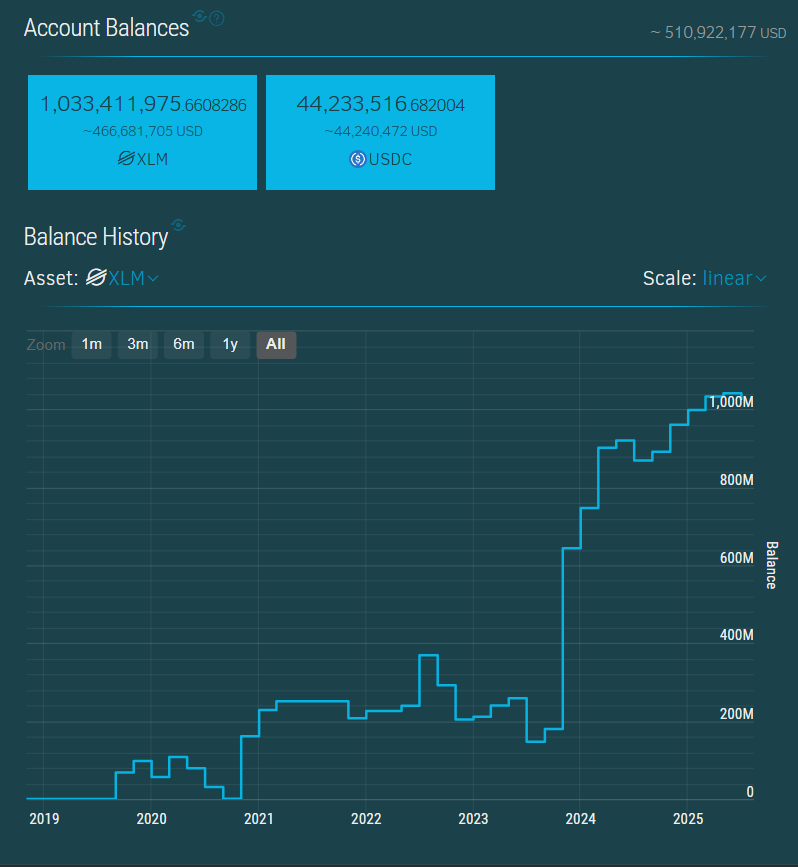El informe de Prueba de Reservas de Binance reveló públicamente su dirección de monedero XLM como “GBAI…GPA.” Según Stellar Expert, el saldo de esta dirección se disparó de 2024 a 2025, alcanzando un pico de 1,033,411,975 XLM en julio-agosto de 2025.
