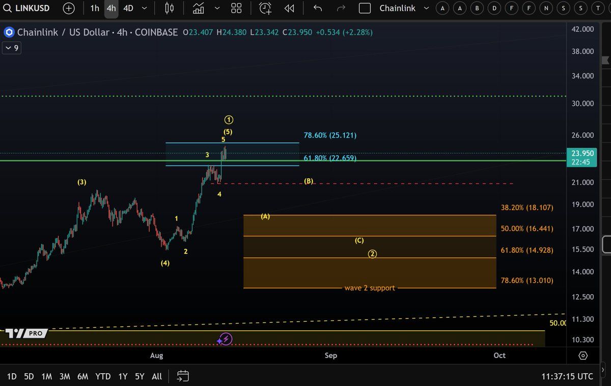 Desde una perspectiva de análisis técnico, LINK ha completado la esperada quinta ola de su tendencia alcista y ahora se acerca a la zona clave de 25 dólares. Los analistas sugieren que si LINK supera este nivel, podría entrar en una ruptura directa hacia el objetivo de 47 dólares en el gráfico a largo plazo.