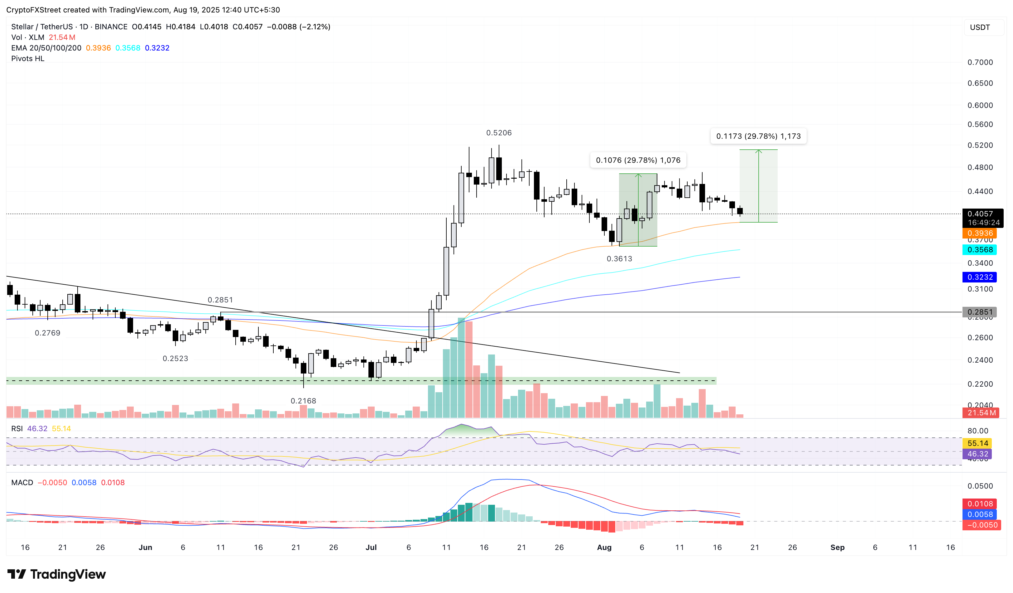 Stellar cae un 2% en el momento de la publicación el martes, extendiendo la pérdida del 2.36% del lunes. La tendencia a la baja se acerca a la EMA de 50 días en 0.3936$ mientras persiste la presión superior.