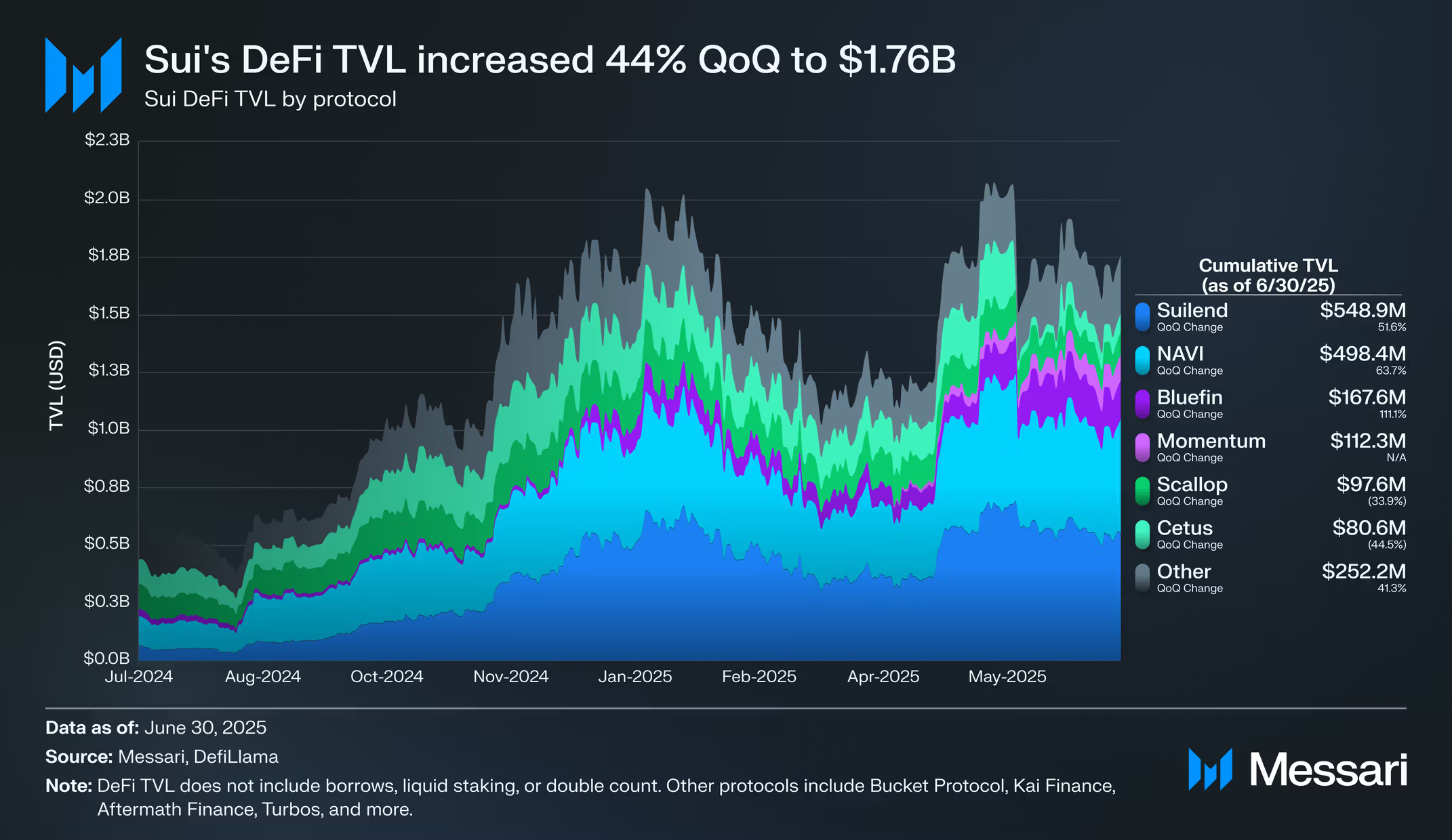 Otro punto destacado provino de las entradas de capital en DeFi. El Valor Total Bloqueado (TVL) de Sui aumentó un 44.3% respecto al trimestre anterior, alcanzando 1,76 mil millones de dólares.
