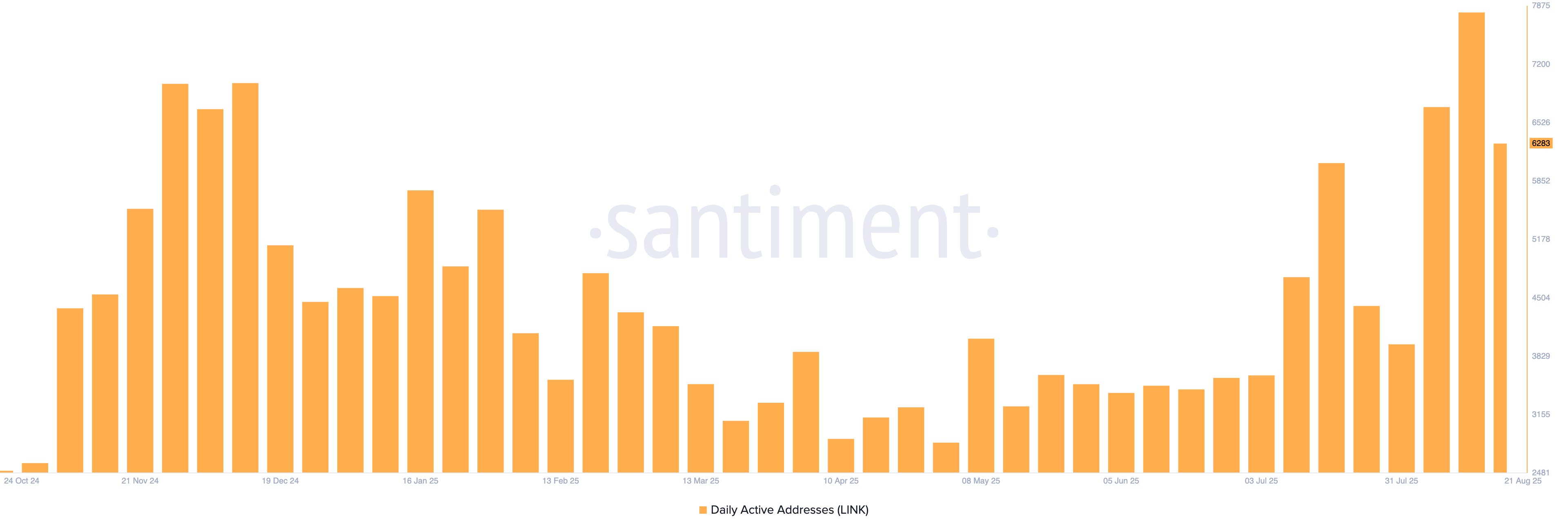 En medio del sentimiento de riesgo, la actividad en la red de Chainlink se mantiene en niveles más altos en comparación con la caída de marzo a julio. Las direcciones activas diarias mantuvieron un promedio de 7.797 la semana pasada, el más alto en 2025.