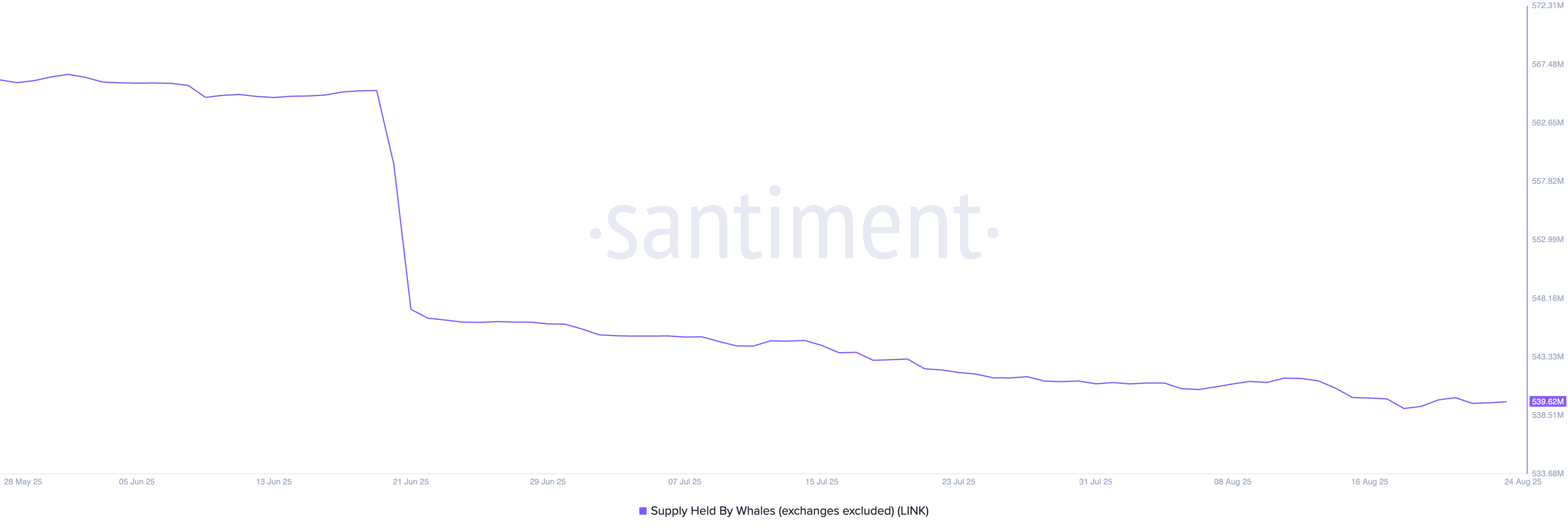 Aún así, los grandes inversores de carteras, conocidos popularmente como ballenas, están descargando sus tenencias, alcanzando un mínimo histórico de 539.07 millones de tokens LINK el 18 de agosto. En la actualidad, se sitúa en 539.62 millones de tokens.