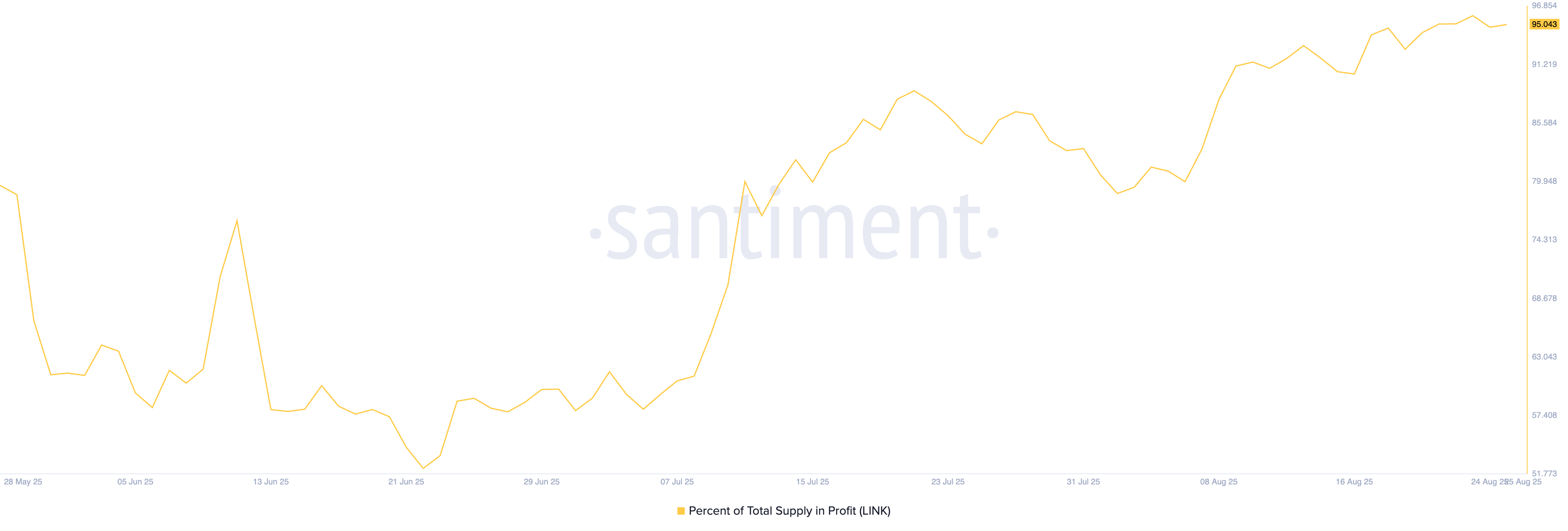 Los datos de Santiment muestran que la oferta de tokens LINK en beneficios (comprados a un precio inferior al valor de mercado actual) está en 95.04%, un aumento desde el 80.57% el 1 de agosto. Típicamente, niveles elevados de oferta en beneficios indican una mayor confianza de los inversores y una tendencia alcista en movimiento.