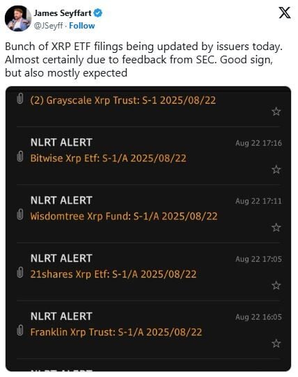 Mientras tanto, antes de una posible aprobación, todos los emisores de ETF de XRP han modificado sus solicitudes S-1. Seyffart señaló que este avance se debe casi con certeza a los comentarios de la SEC. Lo describió como una buena señal, aunque afirmó que también era bastante esperado.