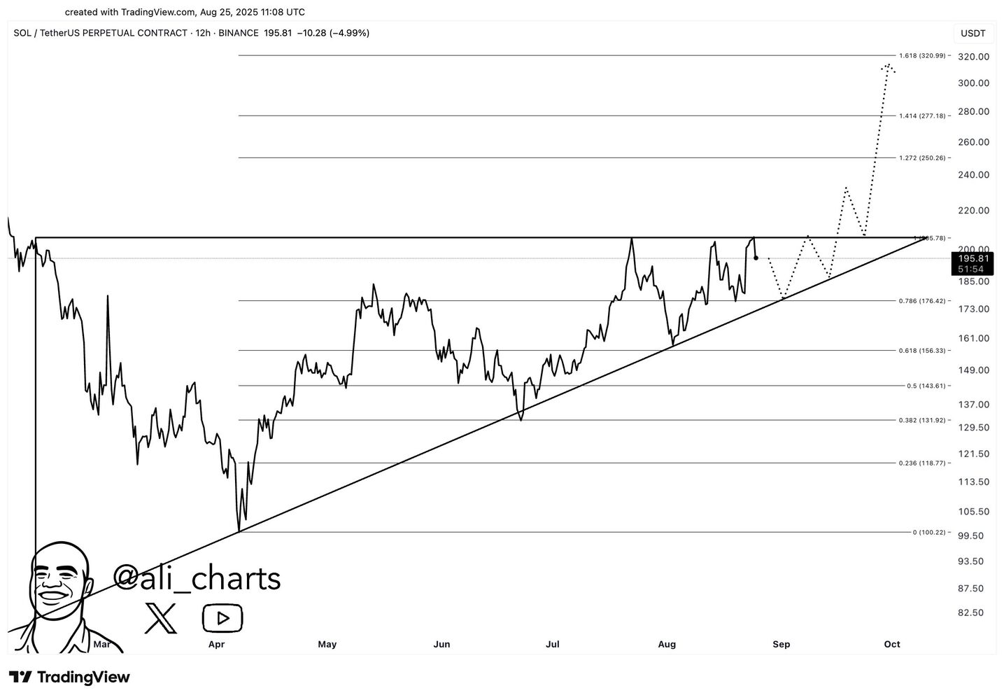 A pesar de la vacilación a corto plazo, el objetivo de 300 dólares no ha desaparecido. Analistas como Alí Martínez señalan que si SOL cae hacia los 176 dólares, podría encontrar un fuerte soporte antes de volver a intentarlo. Por otro lado, una ruptura clara por encima de 207-215 dólares convertiría la resistencia en soporte y confirmaría la continuación de la tendencia alcista. Las extensiones de Fibonacci incluso apuntan a 300 dólares como el objetivo lógico para el próximo gran movimiento.