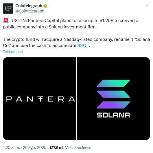 Uno de los titulares más importantes proviene de Pantera Capital, que reveló planes para recaudar hasta 1.250 millones de dólares solo para construir una tesorería de Solana. ¿La idea? Adquirir una empresa que cotiza en el Nasdaq, renombrarla como "Solana Co." y canalizar el capital hacia SOL. Es una estrategia audaz, pero revela todo lo que necesita saber sobre hacia dónde creen las instituciones que se dirige el valor. Durante mucho tiempo, Solana fue considerada una apuesta de alto riesgo. Ahora, está atrayendo asignaciones de miles de millones de dólares y presentaciones de ETF, una clara señal de que la narrativa está cambiando.