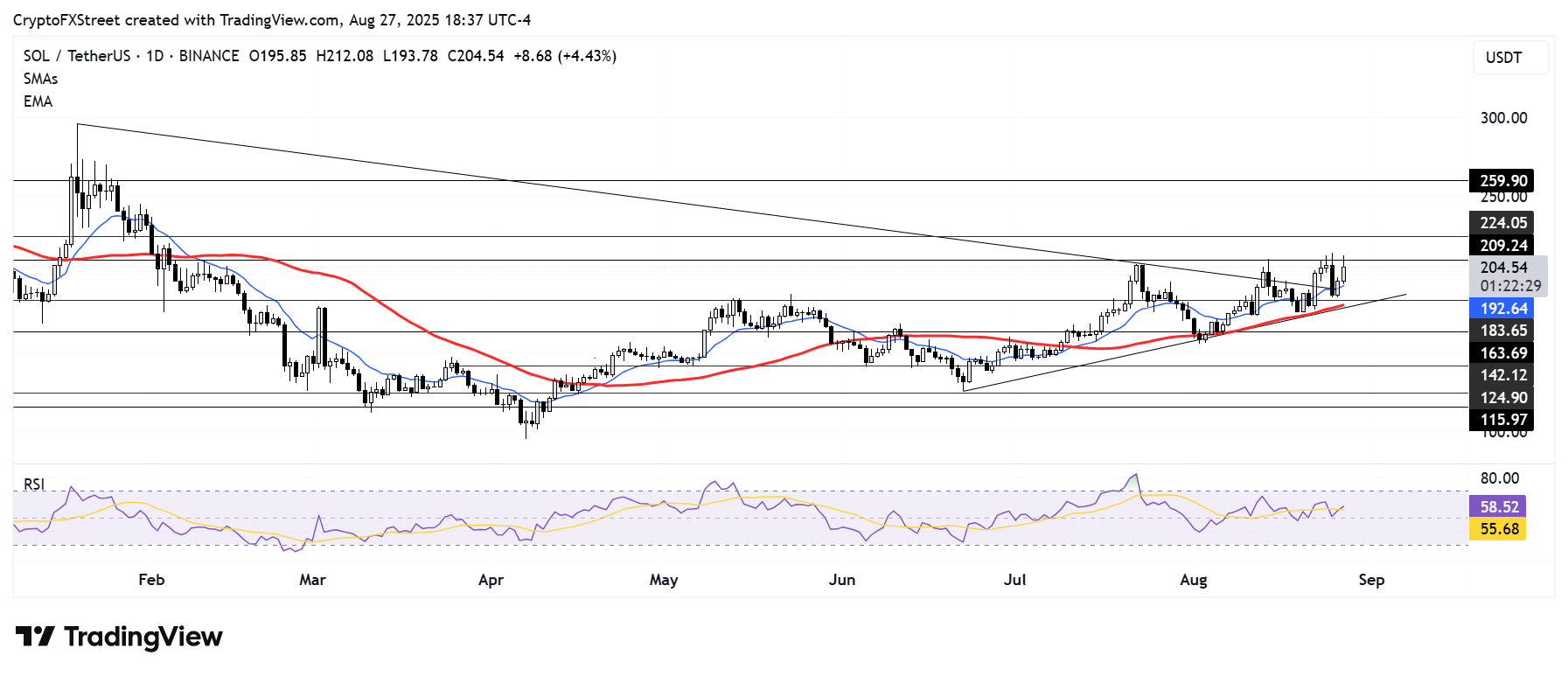 SOL ha subido un 5% en las últimas 24 horas, cotizando alrededor de 205$ en el momento de la publicación. La cuarta altcoin más grande está probando la resistencia de 209$ mientras apunta a un posible movimiento hacia 224$.