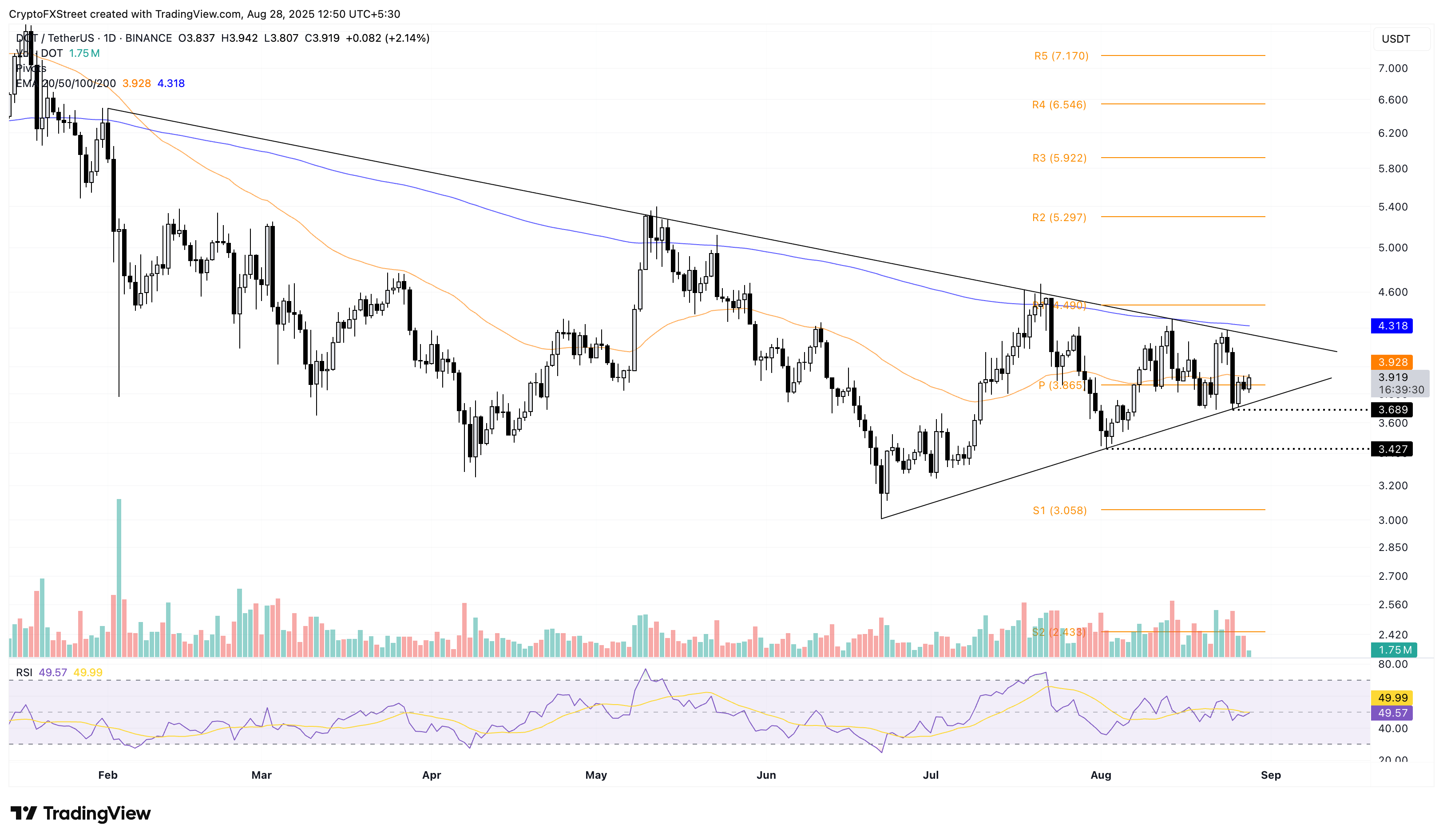 Polkadot rebota dentro de un patrón de triángulo simétrico en el gráfico diario, desafiando la media móvil exponencial (EMA) de 50 días en 3.928$. El token de blockchain multichain podría tener como objetivo la EMA de 200 días en 4.318$, acercándose a la línea de tendencia del límite superior del triángulo.