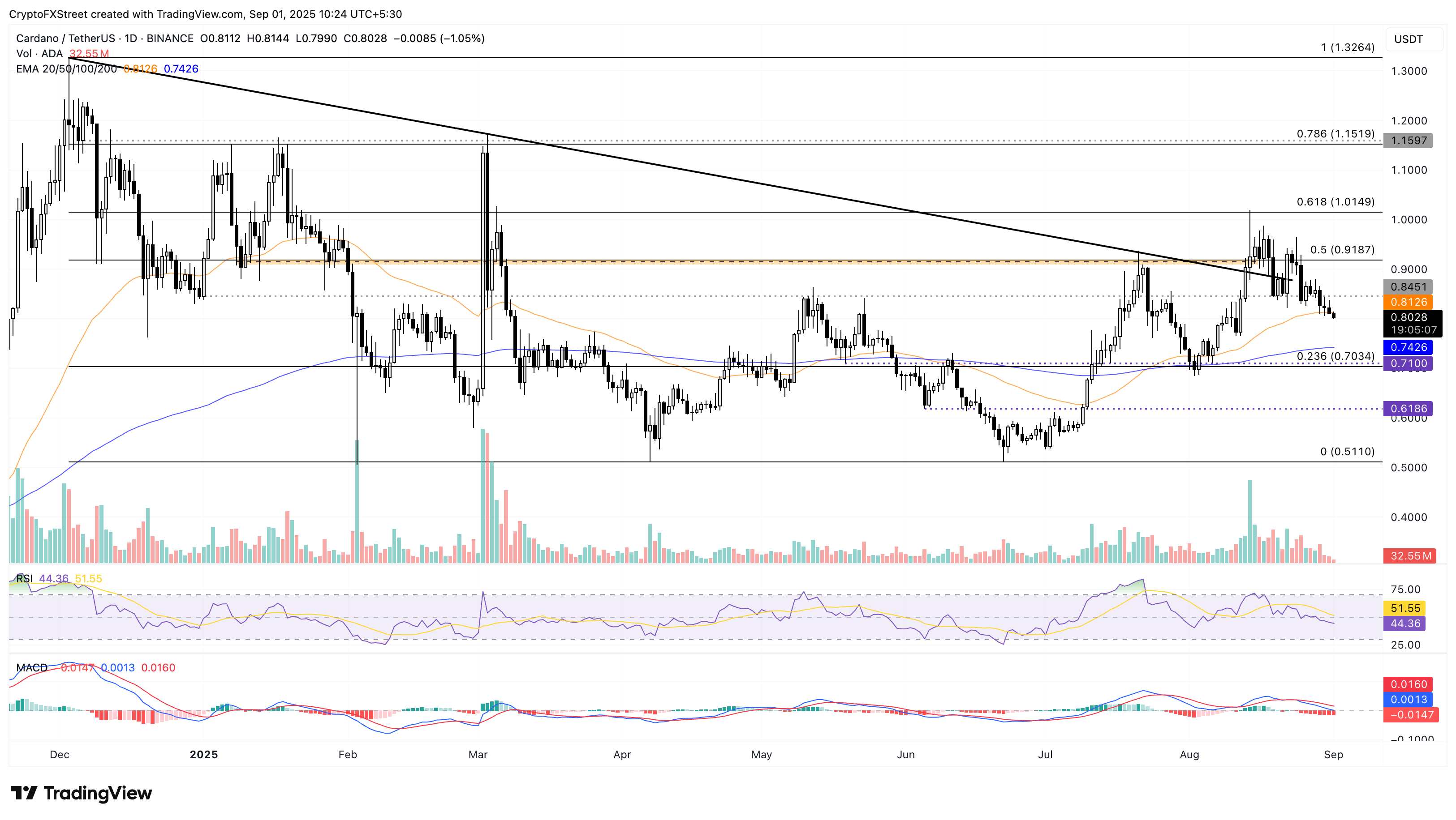 Cardano baja un 1% en el momento de la publicación el lunes, extendiendo las pérdidas por cuarto día consecutivo. La tendencia a la baja en ADA cae bruscamente por debajo de la media móvil exponencial (EMA) de 50 días en 0.8126$, apuntando a la EMA de 200 días en 0.7426$.