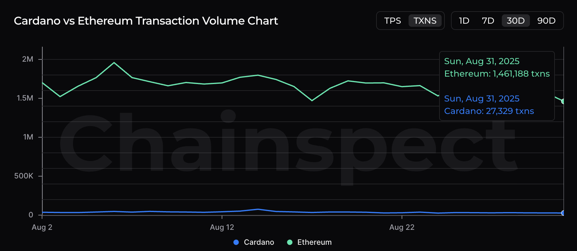 Además, las transacciones en las dos blockchains destacan la enorme diferencia en la adopción de usuarios. Los datos de Chainspect muestran 1.46 millones de transacciones diarias en Ethereum en comparación con 27,329 transacciones en Cardano.
