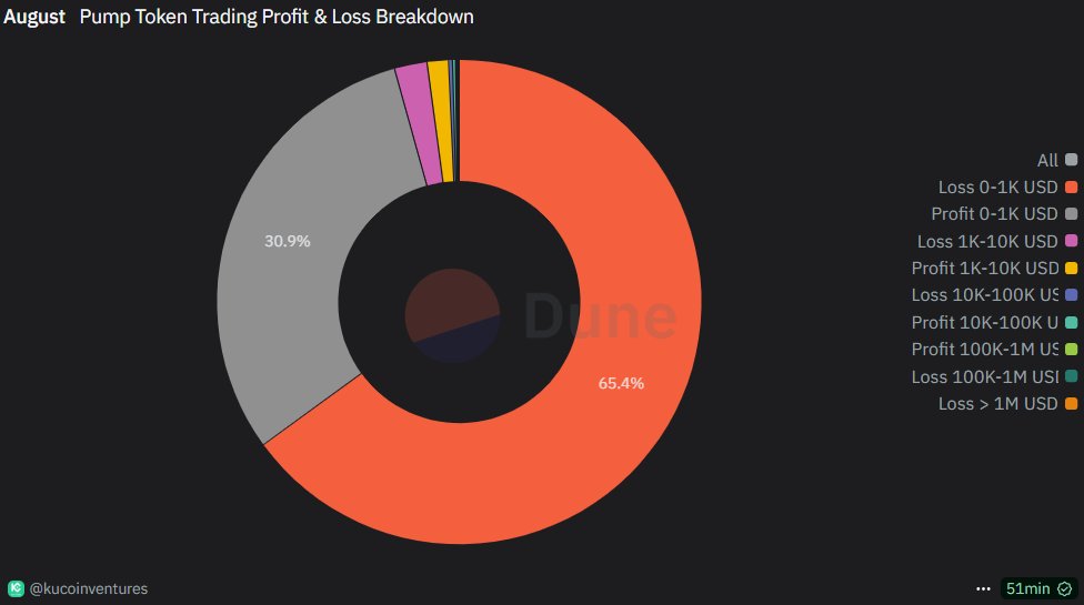 Según datos compilados por Defioasis, PumpFun lanzó 595,000 nuevos memecoins en hacesto, liderando nuevamente las plataformas basadas en Solana. A pesar de contar con aproximadamente 1.35 millones de direcciones activas, la mayoría de los usuarios sufrieron pérdidas. Más del 60% de los participantes terminaron el mes con pérdidas, y ninguna dirección individual ganó más de $1 millón.