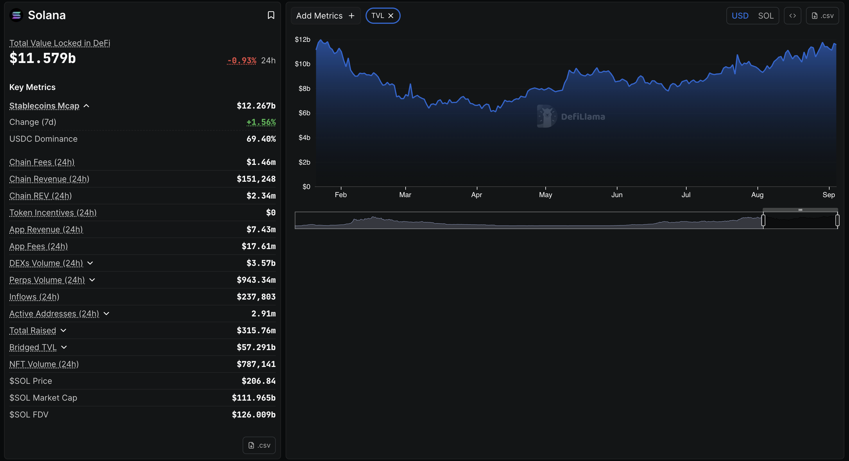 Además, DeFiLlama muestra que el Valor Total Bloqueado (TVL) en Solana es de 11.579 millones de dólares, acercándose al récord de 11.989 millones de dólares establecido en enero.