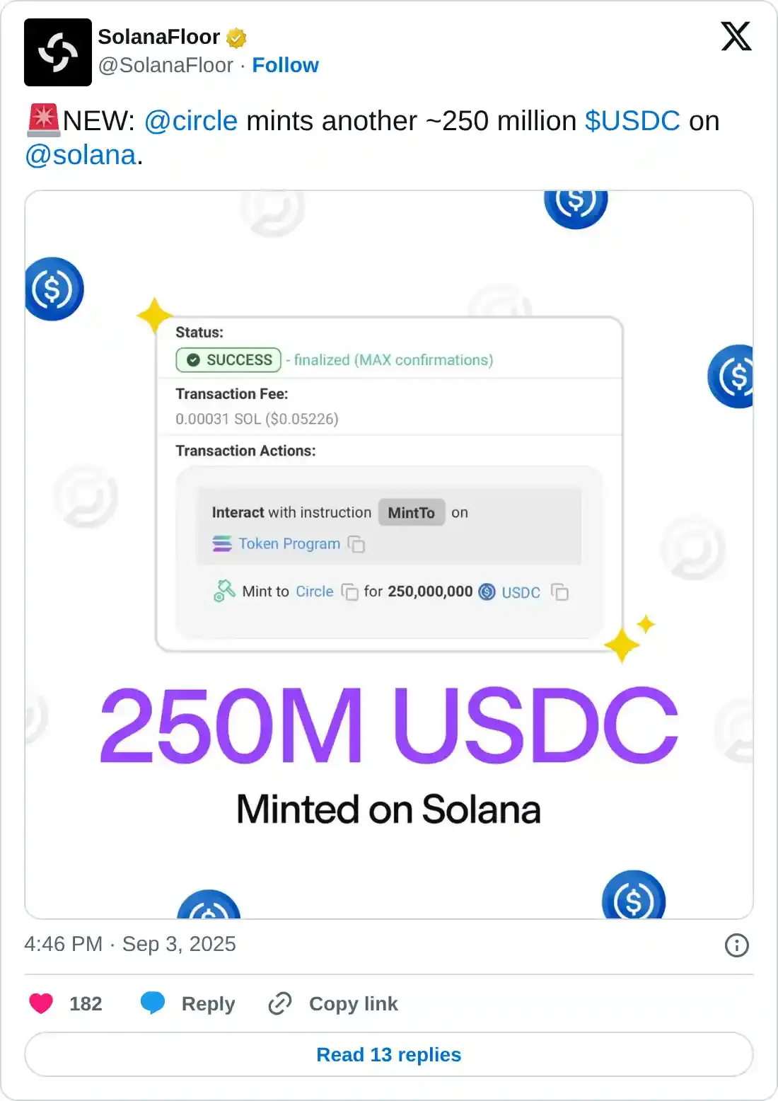 El aumento de liquidez en Solana está respaldado por una creciente capitalización de mercado de stablecoins que alcanza los 12.267 millones de dólares, de los cuales el USDC de Circle domina el 69.40% tras la reciente acuñación de 250 millones de USDC el miércoles.