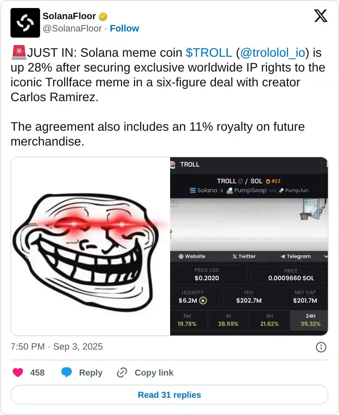Notablemente, la moneda meme TROLL basada en Solana ha alcanzado un hito al asegurar derechos de propiedad intelectual (IP) exclusivos a nivel mundial para el popular meme Trollface tras un acuerdo de alto valor con el creador Carlos Ramirez, que incluye una regalía del 11%. El acuerdo ha provocado un aumento de dos dígitos en el precio al contado de TROLL.