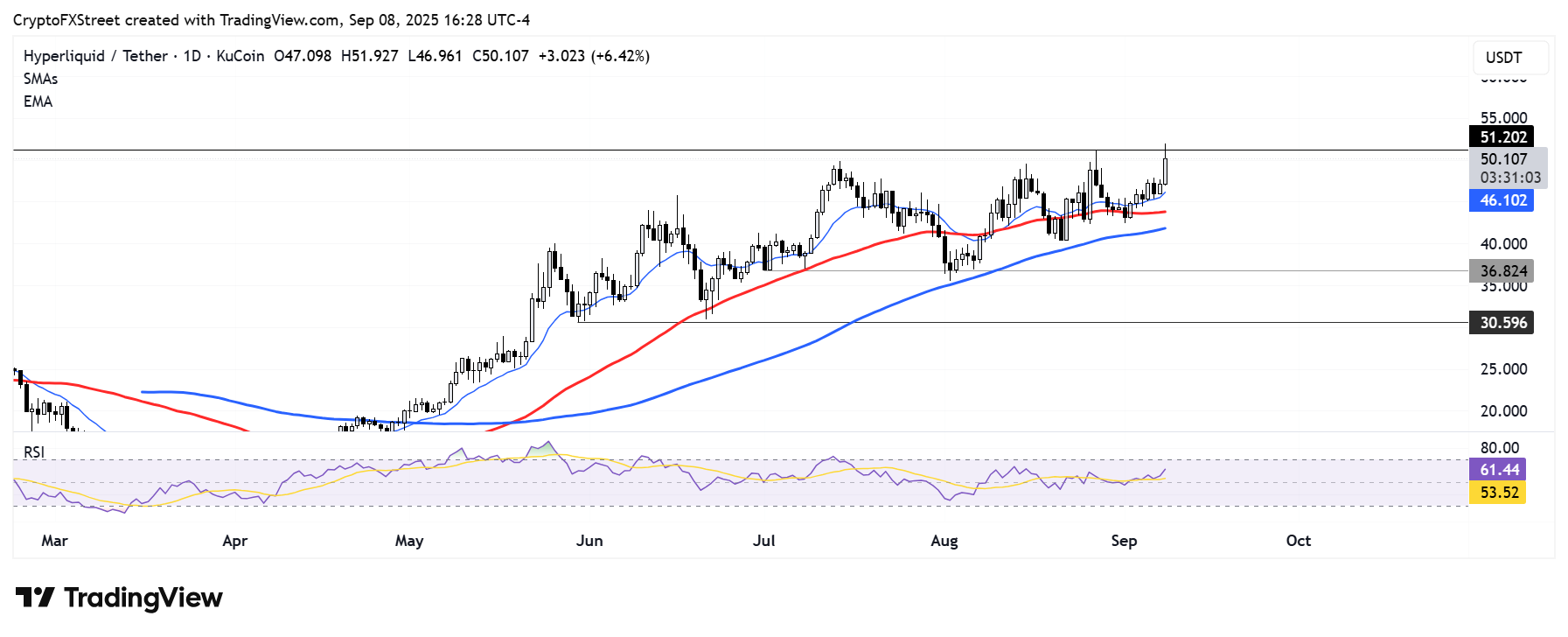 HYPE se disparó a un nuevo máximo histórico tras los desarrollos, subiendo a 51.92$ antes de retroceder a 50.10$ en el momento de la publicación, un aumento de más del 7% en las últimas 24 horas, según datos de Binance.
