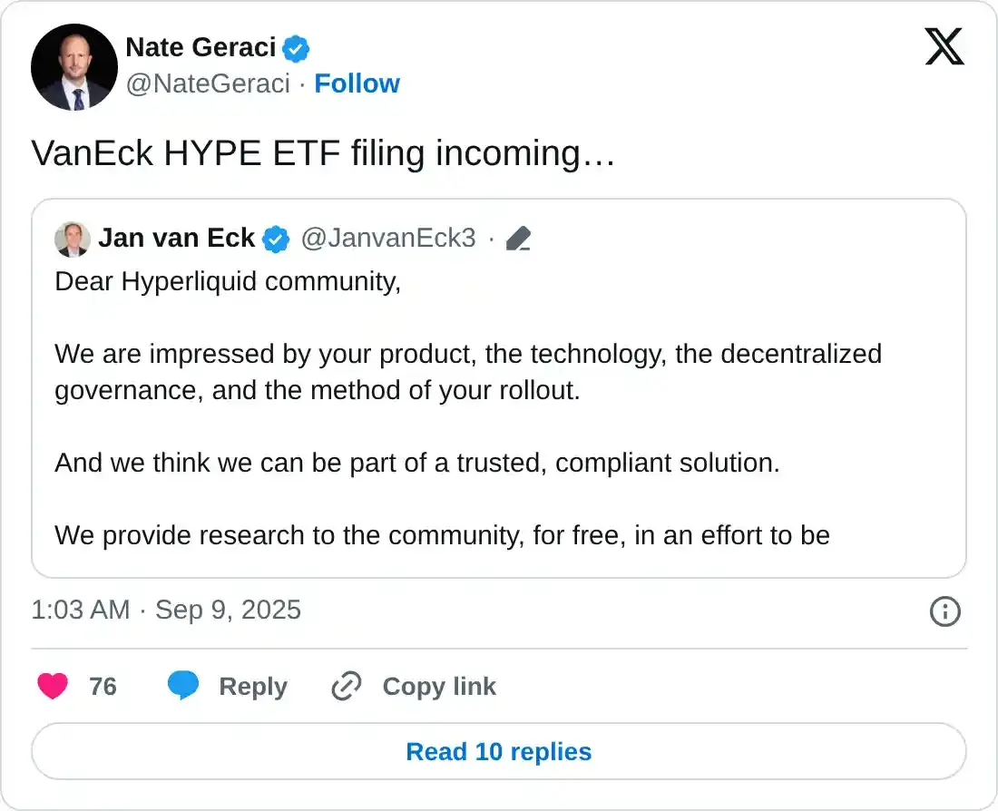 En medio de la propuesta, Nate Geraci, cofundador del ETF Institute, anticipa un potencial fondo cotizado (ETF) de HYPE de VanEck.