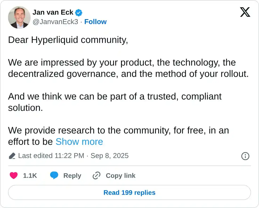 Jan Van Eck apeló a la comunidad de Hyperliquid en una publicación en X el martes, elogiando la plataforma, la tecnología, el modelo de gobernanza descentralizada y el método de implementación como un intento de asegurar la emisión de la stablecoin USDH con la propuesta de Agora. Van Eck se posiciona como una "solución confiable y conforme" al resaltar la investigación gratuita proporcionada a la comunidad.