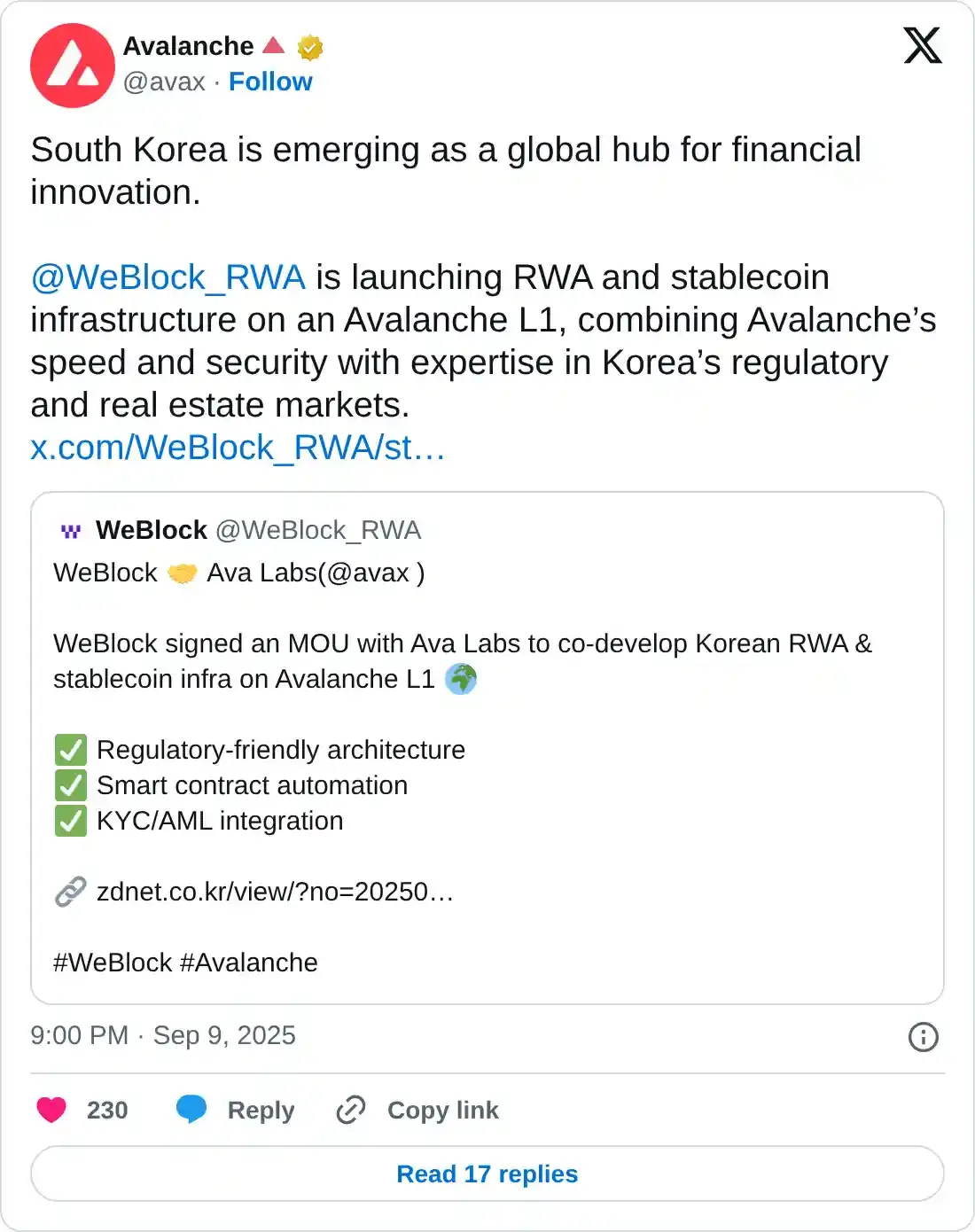 Ava Labs, el equipo detrás de Avalanche, firmó un acuerdo de MoU con WeBlock para impulsar la tokenización de RWAs y stablecoins en Corea del Sur. Los productos de RWA compatibles con la regulación coreana se construirán sobre la blockchain de capa 1 de Avalanche e integrarán características de Conozca a su Cliente (KYC) y Anti-Lavado de Dinero (AML).