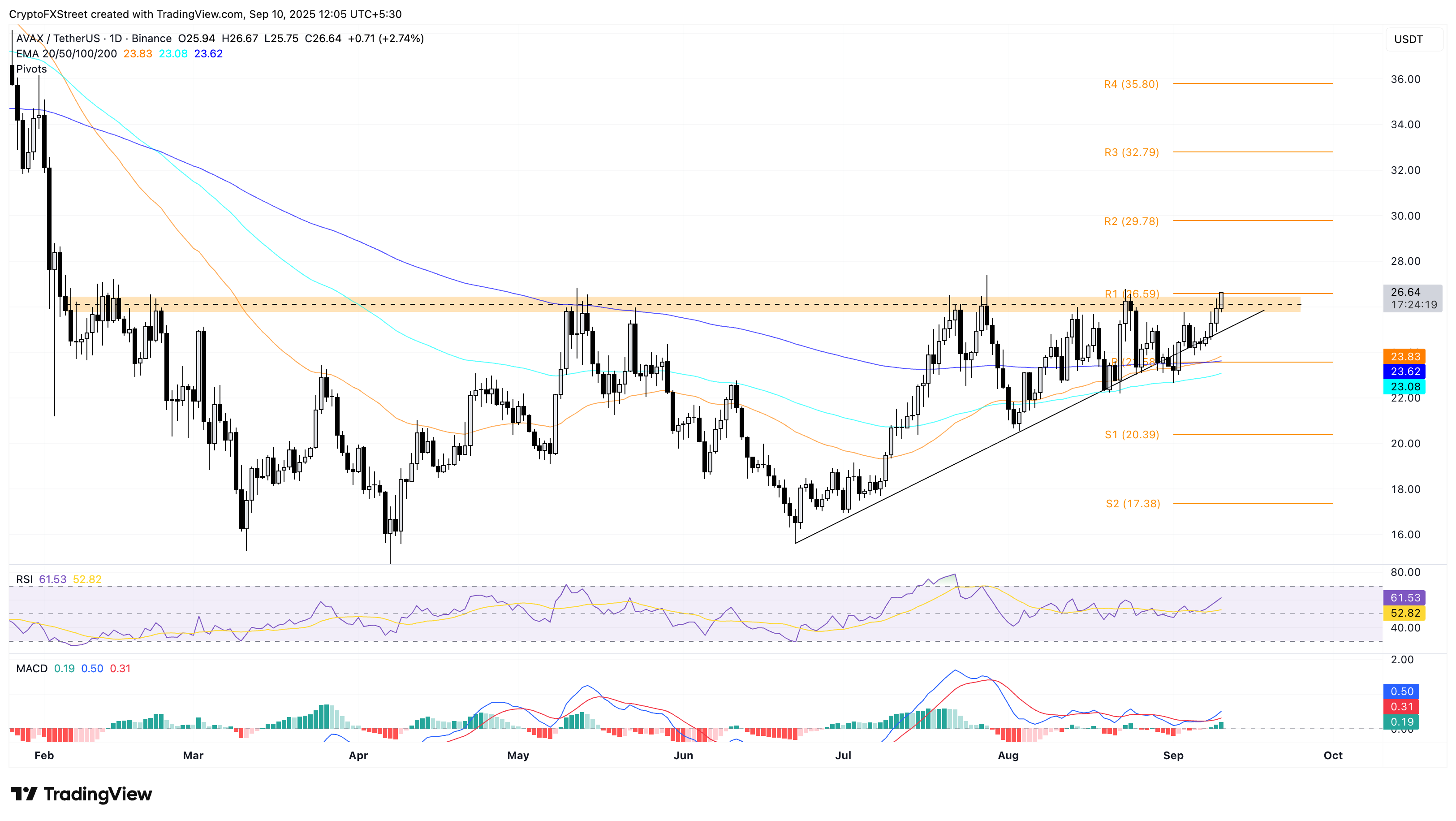 AVAX mantiene un aumento estable por encima de 25$ en el momento de la prensa el miércoles, insinuando un posible breakout de la zona de oferta entre 25.75$ y 26.50$, marcada como una banda amarilla en el gráfico diario compartido a continuación.