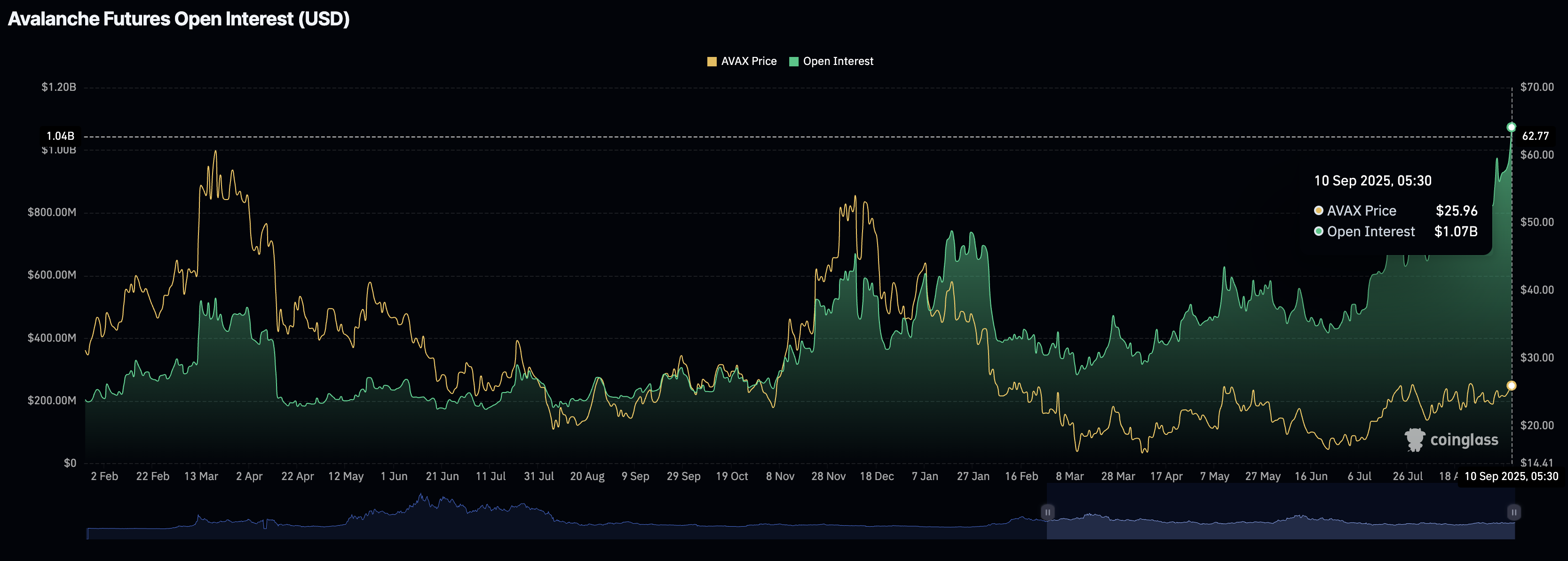 Los datos de CoinGlass muestran que el Interés Abierto (OI) de AVAX ha alcanzado un récord histórico de 1.07 mil millones de dólares, subiendo desde 974.94 millones de dólares el martes. Esto indica una entrada significativa de capital en las últimas 24 horas, sugiriendo que el sentimiento de riesgo ha mejorado entre los traders a medida que anticipan una mayor recuperación en Avalanche.