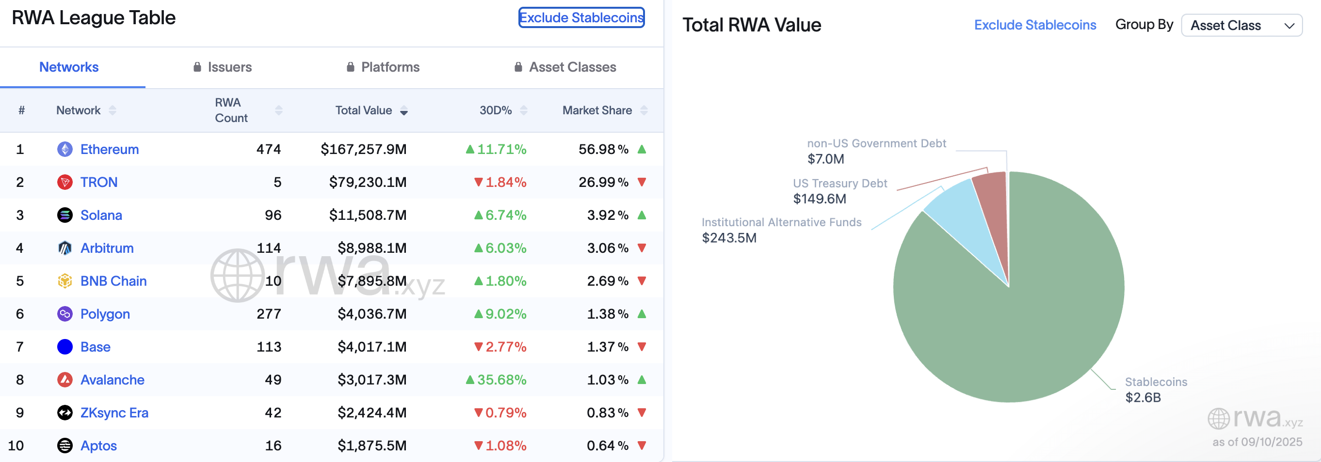 RWA.xyz, una plataforma de análisis de datos de RWA, clasifica a Avalanche como el octavo proyecto más grande basado en el valor de los productos tokenizados, incluidas las stablecoins. Avalanche posee activos tokenizados por un valor de 3.01 mil millones de dólares, de los cuales las stablecoins representan 2.6 mil millones de dólares, seguidas por fondos alternativos institucionales con 243.5 millones de dólares y deuda del Tesoro de EE.UU. (149.6 millones de dólares).