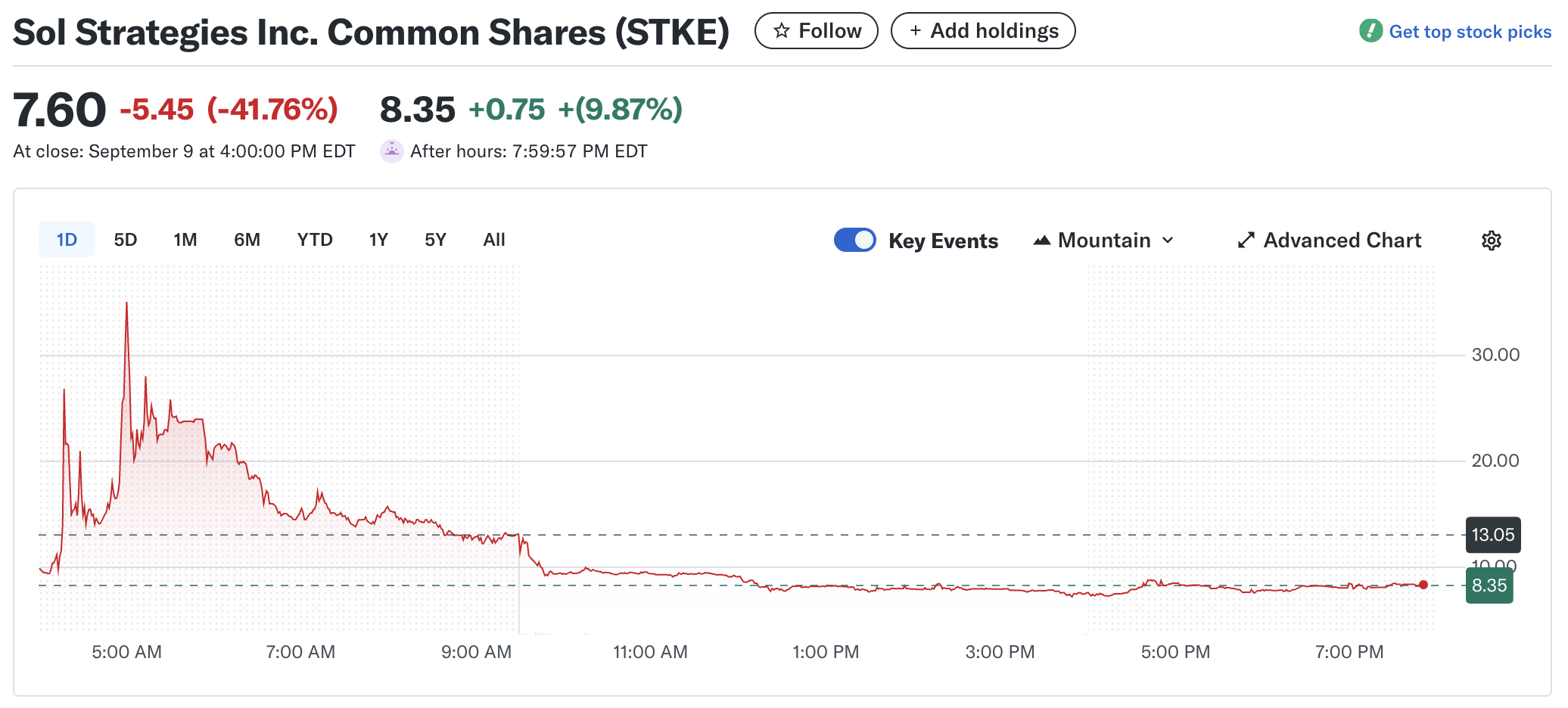 Según datos de Yahoo Finance, las acciones de STKE cerraron a $7.60, una caída del 41.76%, el 9 de septiembre. La negociación previa a la apertura vio un aumento del 9.87%, con acciones cotizando a $8.35.